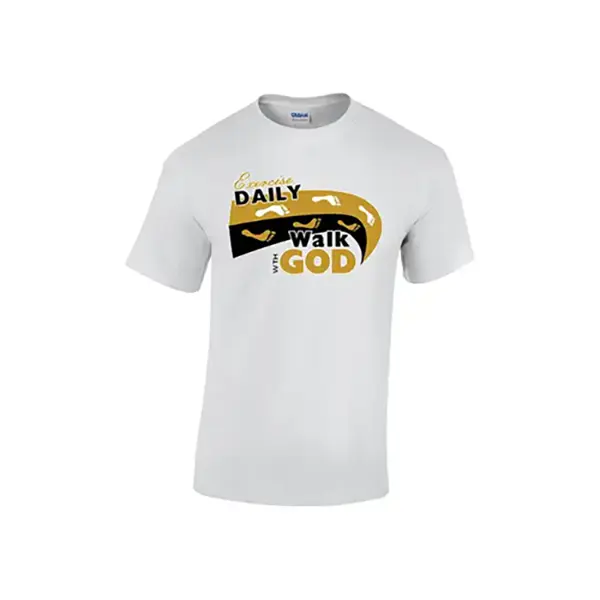Exercise Daily Walk with God reminds how to connect daily with the Father. This 50/50 cotton short sleeve T-shirt is available in White or Black in sizes S – 3XL..