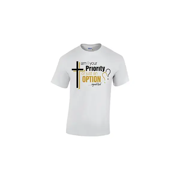 ‘Am I Your Priority or Just an Option? signed God‘ is a thought provoking concept many have to answer internally. This 50/50 cotton short sleeve T-shirt is available in White or Black in sizes S – 3XL.
